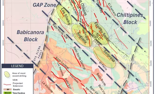 Surface and underground expansion and infill drilling at the Babicanora Block continues to target near-resource extensions, supporting inferred-to-indicated conversion while maintaining a strong pipeline of scout drilling targets. Recent expansion drilling in the Las Chispas Block and Gap Zone has demonstrated growth in multiple veins, including Augusta, La Sorpresa, Los Sheiks, North Las Chispas and Las Chispas Extension (as shown in Figure 1). A newly completed ramp between the Las Chispas and Babicanora Norte veins is providing underground access for infill drilling with the goal of advancing these discoveries into indicated resources.