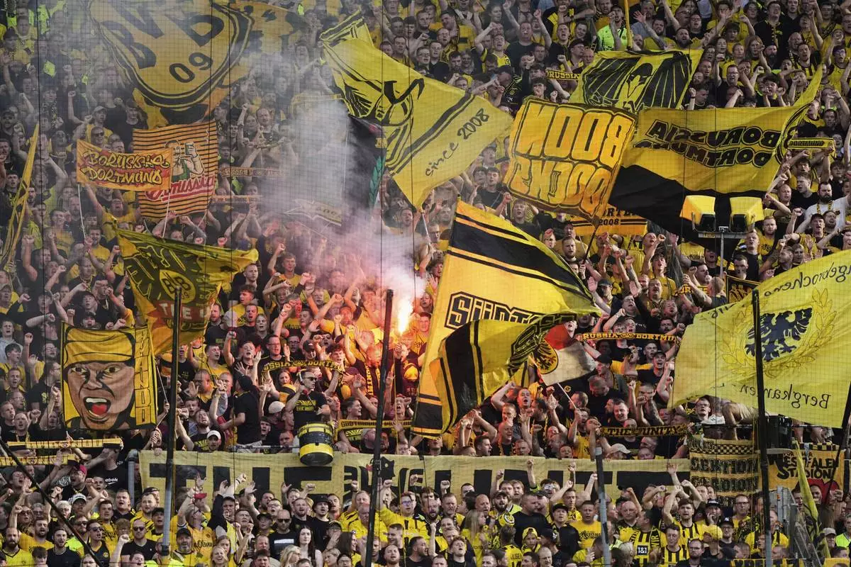 Dortmund fans support their team during the German Bundesliga soccer match between Borussia Dortmund and Union Berlin at the Signal-Iduna Park in Dortmund, Germany, Sunday, Aug. 31, 2025. (AP Photo/Martin Meissner)