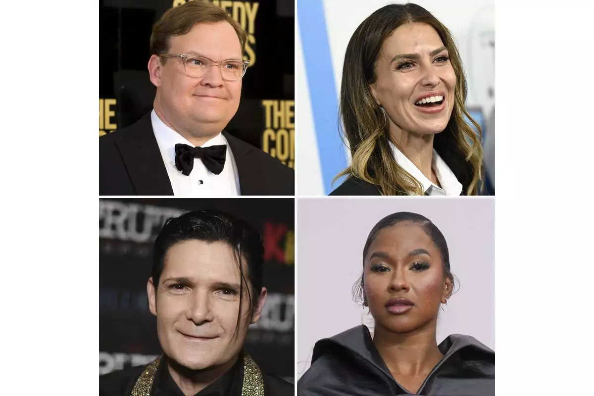 FILE - This photo combination shows, from top left, Andy Richter in New York, April 28, 2012, Hilaria Baldwin, June 22, 2021, in New York, Corey Feldman, March 9, 2020, in Los Angeles and Jordan Chiles, June 9, 2025, in Los Angeles. (AP Photo/Charles Sykes, Evan Agostini, Richard Shotwell, Jordan Strauss)