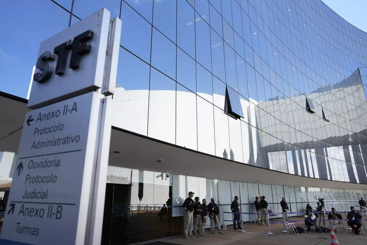 Police stand outside the Supreme Court during the verdict and sentencing phase of a trial for those charged in an alleged coup plot to keep Brazil's former President Jair Bolsonaro in office after his 2022 election defeat, in Brasilia, Brazil, Wednesday, Sept. 3, 2025. (AP Photo/Eraldo Peres)