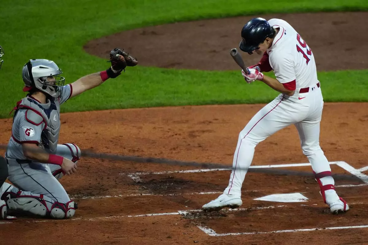 Boston Red Sox outfielder Roman Anthony (19) ducks out of the way on an inside pitch in the second inning of a baseball game against Cleveland Guardians, Tuesday, Sept. 2, 2025, in Boston. (AP Photo/Robert F. Bukaty)