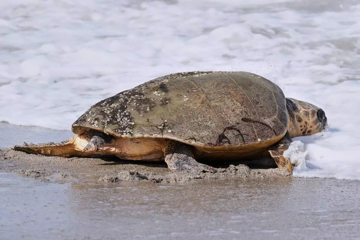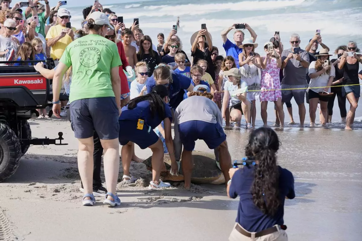 After recovering from health problems a 230 pound loggerhead turtle named June Cleaver is released in the Atlantic Ocean by the Brevard Zoo's Turtle Healing Center Wednesday, Sept. 3, 2025, in Melbourne, Fla. (AP Photo/John Raoux)