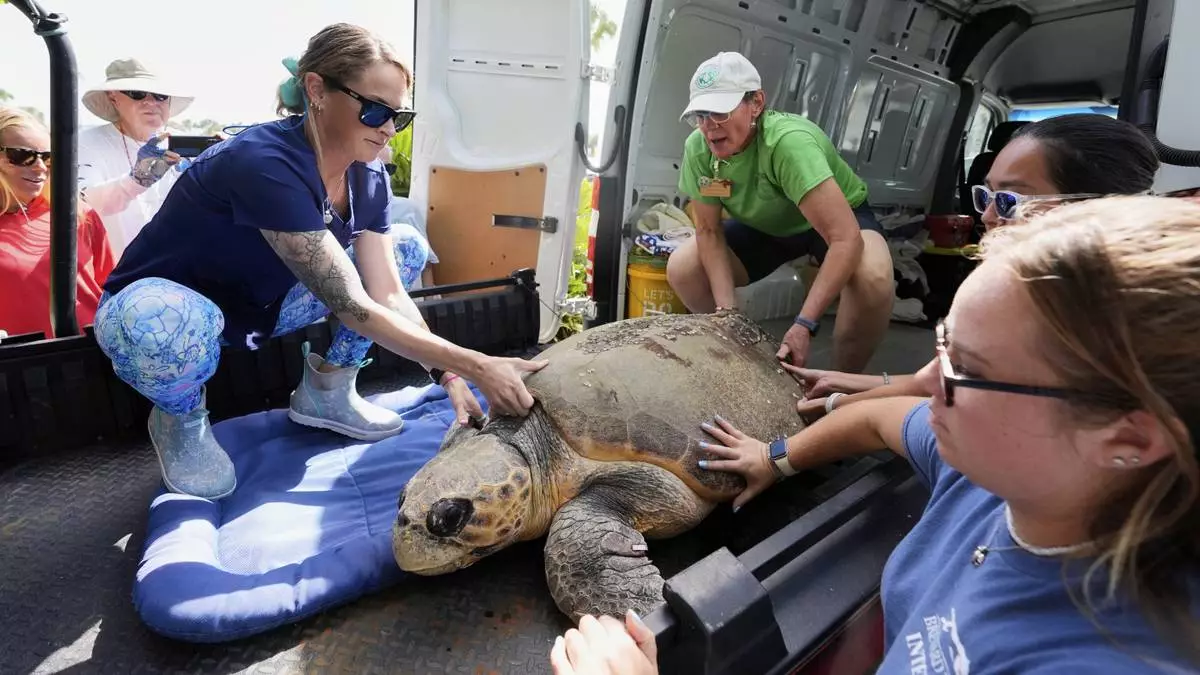 Employees of the Brevard Zoo's Turtle Healing Center load a loggerhead turtle named June Cleaver on a cart before releasing her in the Atlantic Ocean Wednesday, Sept. 3, 2025, in Melbourne, Fla. (AP Photo/John Raoux)