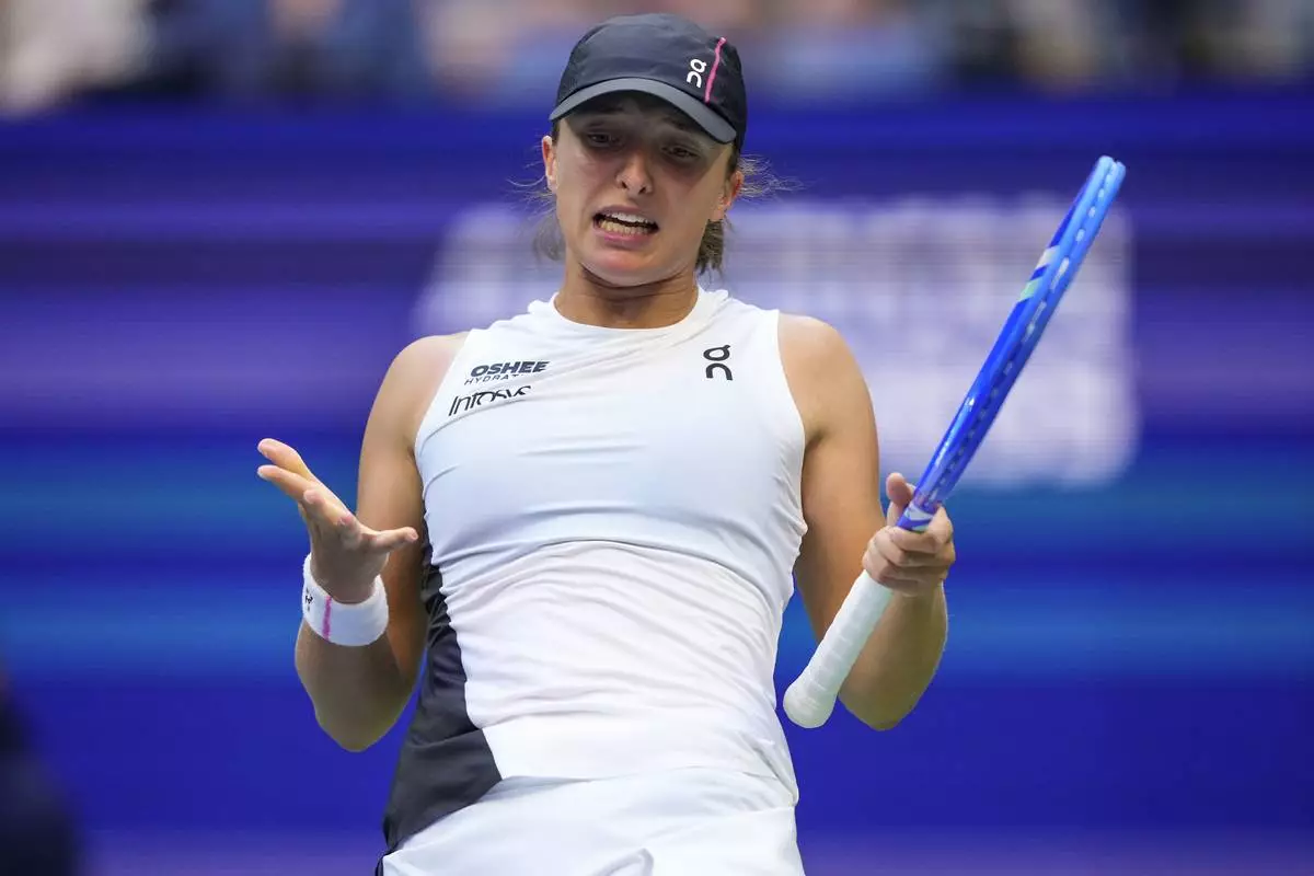 Iga Swiatek, of Poland, reacts after losing a point to Amanda Anisimova, of the United States, during the quarterfinal round of the U.S. Open tennis championships, Wednesday, Sept. 3, 2025, in New York. (AP Photo/Yuki Iwamura)