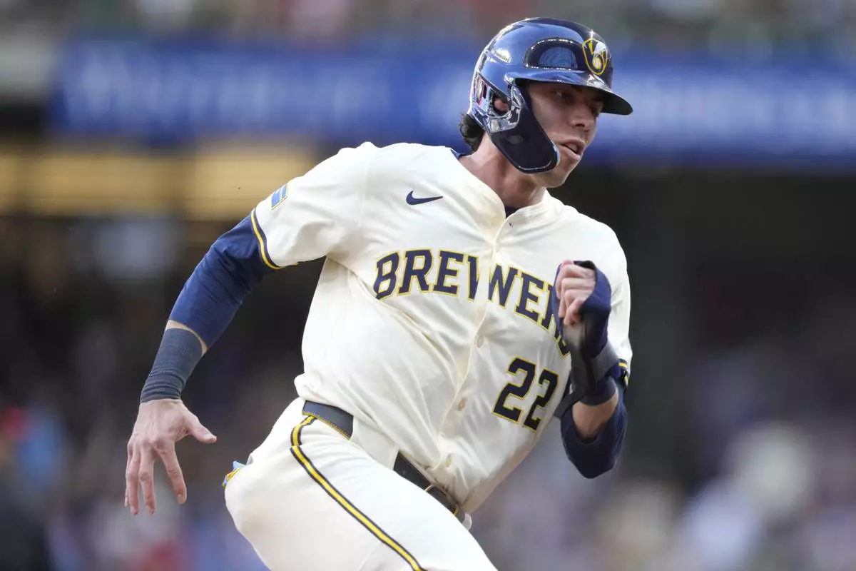 Milwaukee Brewers' Christian Yelich rounds third base on his way to scoring on a two-run RBI double hit by Blake Perkins during the first inning of a baseball game against the Philadelphia Phillies, Monday, Sept. 1, 2025, in Milwaukee. (AP Photo/Kayla Wolf)