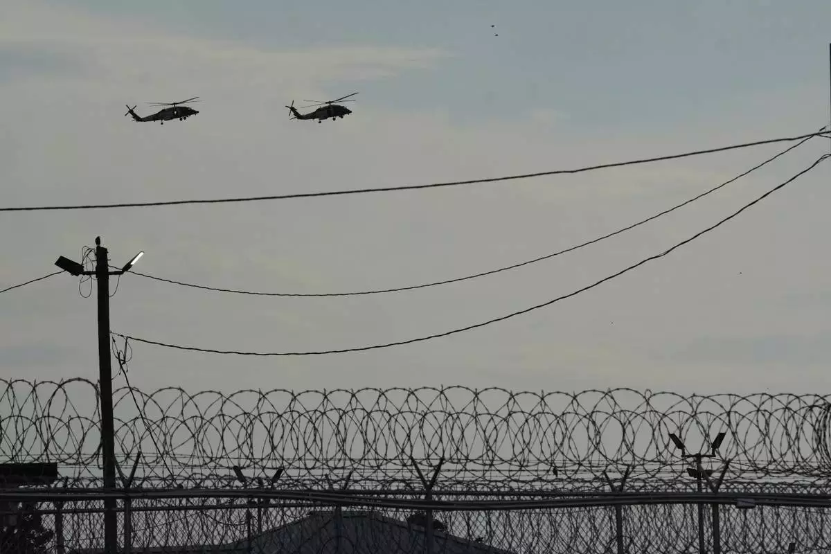 Helicopters in a flotilla transporting Homeland Security Secretary Kristi Noem land near "Camp 57," a facility to house immigration detainees at the Louisiana State Penitentiary in Angola, La., prior to her touring the facility with Louisiana Gov. Jeff Landry, Attorney General Pam Bondi, and ICE Deputy Director Madison Sheahan, Wednesday, Sept. 3, 2025. (AP Photo/Gerald Herbert)