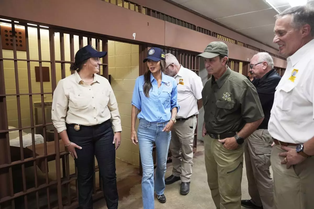 Homeland Security Secretary Kristi Noem, center, tours "Camp 57," a facility to house immigration detainees at the Louisiana State Penitentiary in Angola, La., with Louisiana Gov. Jeff Landry, third left, and ICE Deputy Director Madison Sheahan, left, Sept. 3, 2025. (AP Photo/Gerald Herbert, Pool)