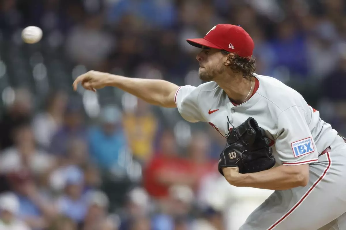 Philadelphia Phillies' Aaron Nola pitches during the first inning of a baseball game against the Milwaukee Brewers, Wednesday, Sept. 3, 2025, in Milwaukee. (AP Photo/Jeffrey Phelps)