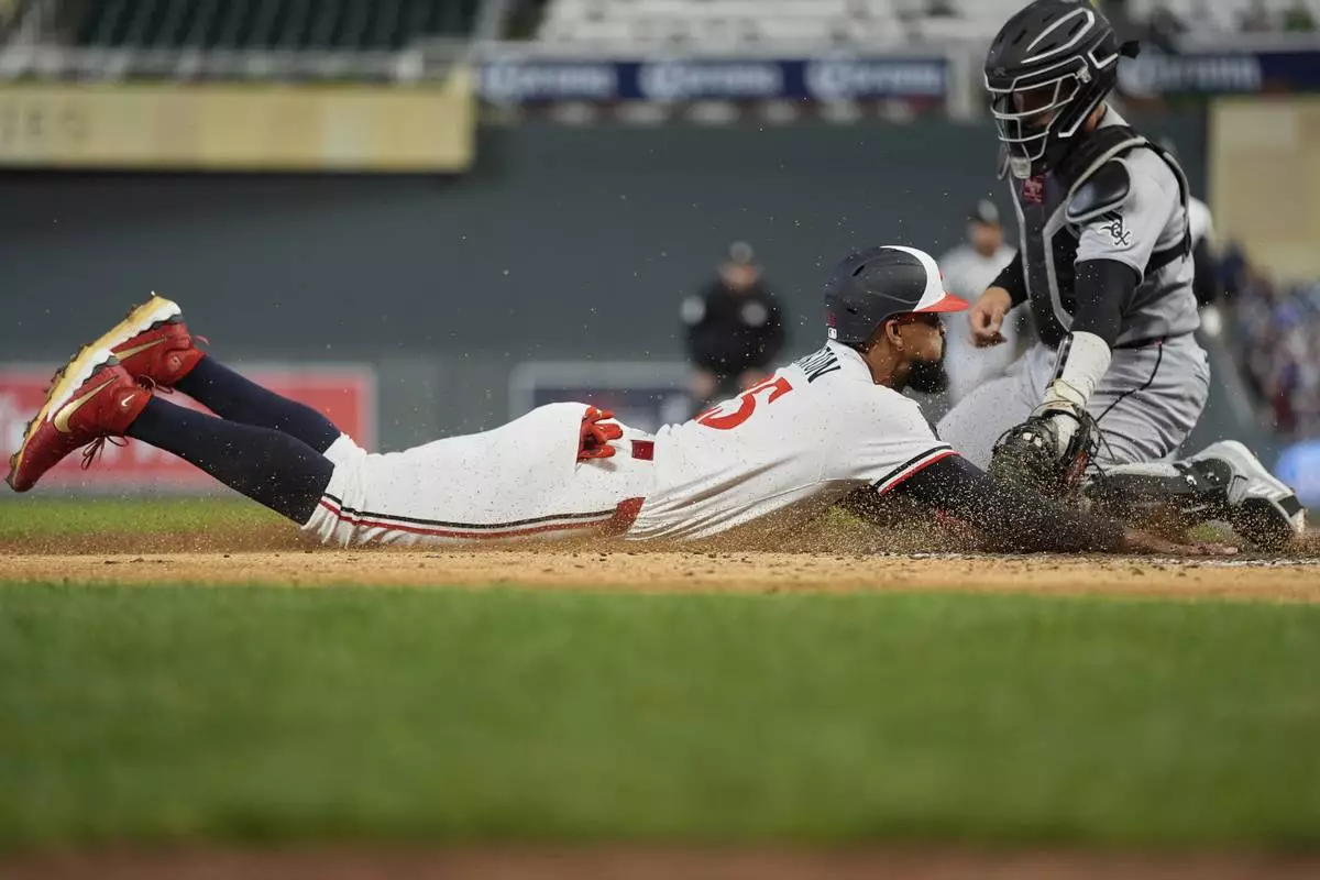Minnesota Twins' Byron Buxton (25) is tagged out by Chicago White Sox catcher Edgar Quero during the fifth inning of a baseball game Wednesday, Sept. 3, 2025, in Minneapolis. (AP Photo/Abbie Parr)
