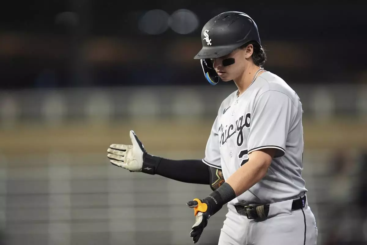 Chicago White Sox's Brooks Baldwin claps after hitting a RBI-single during the ninth inning of a baseball game against the Minnesota Twins Wednesday, Sept. 3, 2025, in Minneapolis. (AP Photo/Abbie Parr)