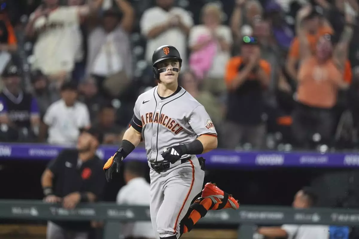San Francisco Giants' Drew Gilbert circles the bases after hitting a solo home urn off Colorado Rockies relief pitcher Juan Mejia in the seventh inning of a baseball game Wednesday, Sept. 3, 2025, in Denver. (AP Photo/David Zalubowski)