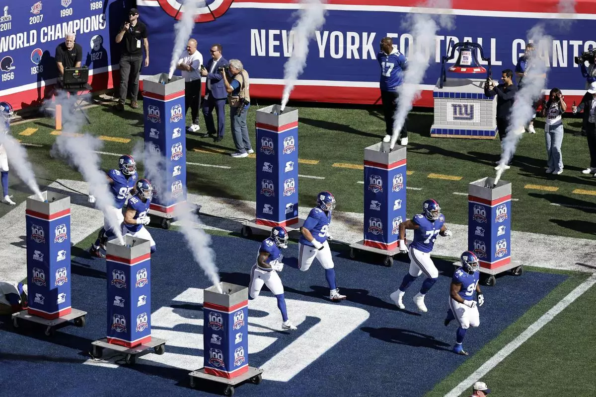 FILE - The New York Giants take the field to face the Philadelphia Eagles during an NFL football game, Oct. 20, 2024, in East Rutherford, N.J. (AP Photo/Adam Hunger, File)