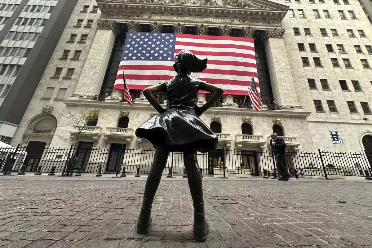 FILE - The Fearless Girl statue stands in front of the New York Stock Exchange in New York's Financial District on Tuesday, Nov. 5, 2024. (AP Photo/Peter Morgan, File)