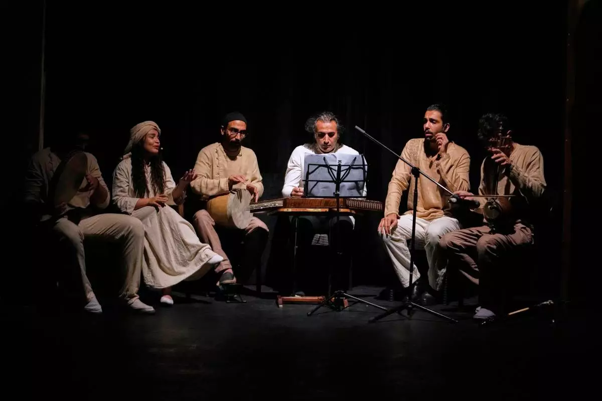 The music band performs during a musical play "Mehrara", a love story which takes place in Qajar dynasty era, directed by Daniyal Ghafari, at Neauphle-le-Château theater hall, in Tehran, Iran, Wednesday, Sept. 3, 2025. (AP Photo/Vahid Salemi)