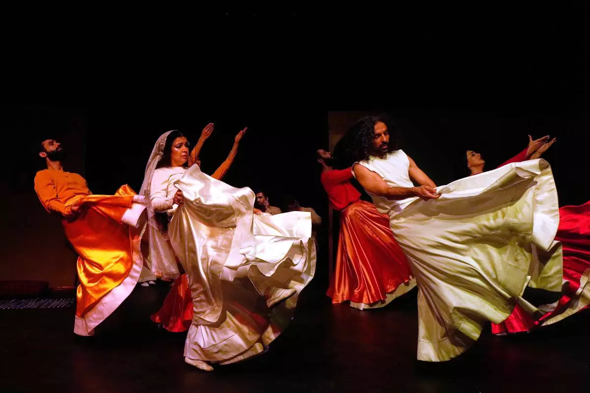 Iranian actors dance during a musical play "Mehrara", a love story which takes place in Qajar dynasty era, directed by Daniyal Ghafari, at Neauphle-le-Chateau theater hall, in Tehran, Iran, Wednesday, Sept. 3, 2025. (AP Photo/Vahid Salemi)