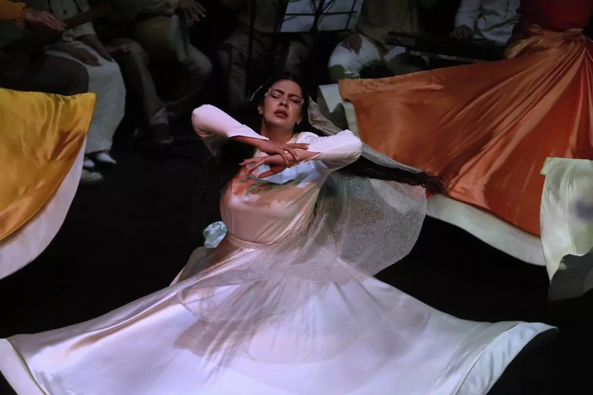 Iranian actress Jeyran Barikani dances during a musical play "Mehrara", a love story which takes place in Qajar dynasty era, directed by Daniyal Ghafari, at Neauphle-le-Château theater hall, in Tehran, Iran, Tuesday, Sept. 2, 2025. (AP Photo/Vahid Salemi)