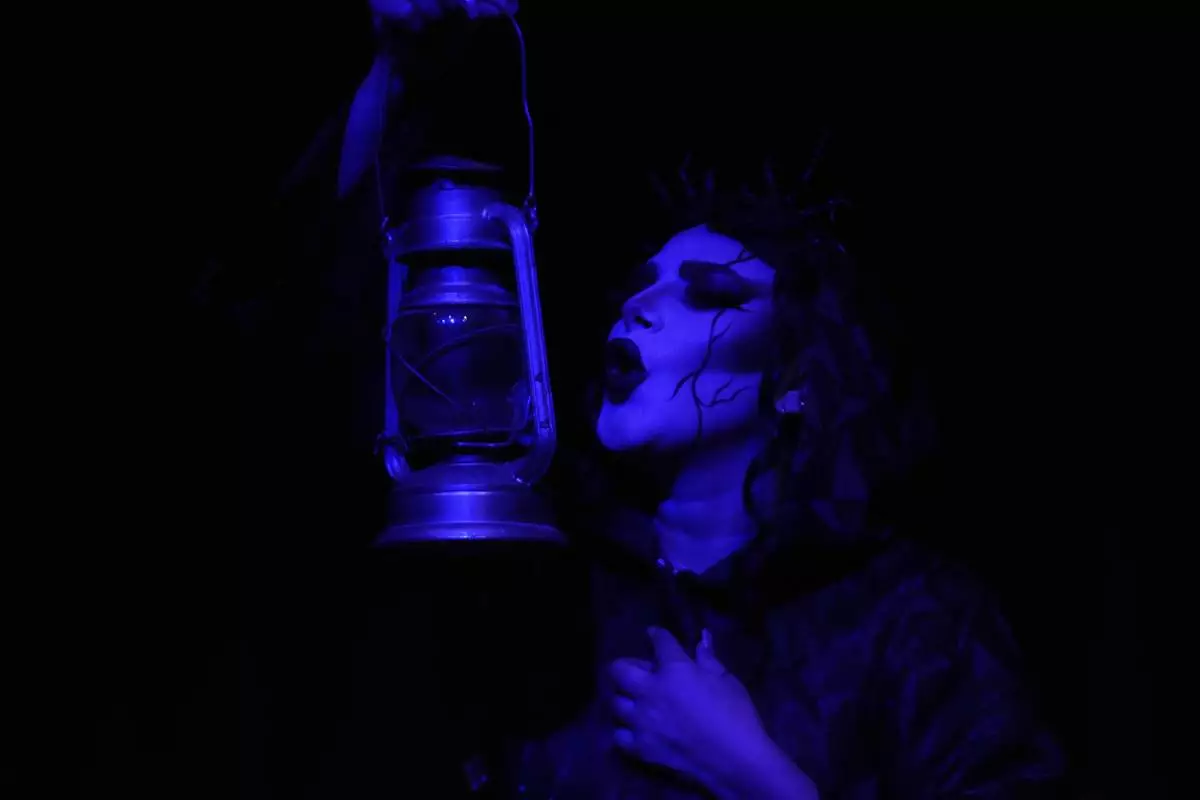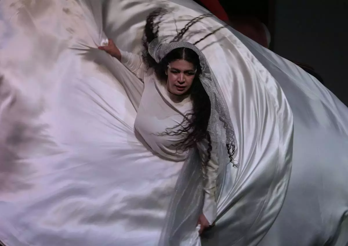 Iranian actress Mahshid Goodarzi performs during a musical play "Mehrara", a love story which takes place in Qajar dynasty era, directed by Daniyal Ghafari, at Neauphle-le-Château theater hall, in Tehran, Iran, Wednesday, Sept. 3, 2025. (AP Photo/Vahid Salemi)