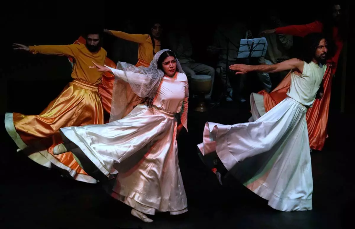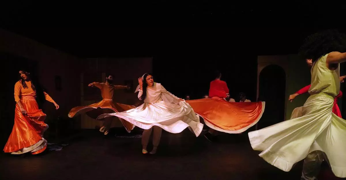 Iranian actress Jeyran Barikani, center, and others dance during a musical play "Mehrara", a love story which takes place in Qajar dynasty era, directed by Daniyal Ghafari, at Neauphle-le-Château theater hall, in Tehran, Iran, Wednesday, Sept. 3, 2025. (AP Photo/Vahid Salemi)