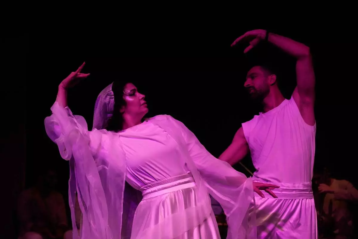 Iranian actors Jeyran Barikani, left, and Kamal Razavi dance during a musical play "Mehrara," a love story which takes place in Qajar dynasty era, directed by Daniyal Ghafari, at Neauphle-le-Château theater hall, in Tehran, Iran, Wednesday, Sept. 3, 2025. (AP Photo/Vahid Salemi)