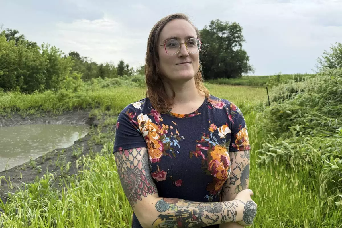 LeAnne Withrow, a transgender federal worker who has filed a class action lawsuit challenging a Trump administration policy prohibiting transgender federal employees from using restrooms aligned with their gender, poses for a photo at her home outside Springfield, Ill., July 30, 2025. (AP Photo/Claire Savage)