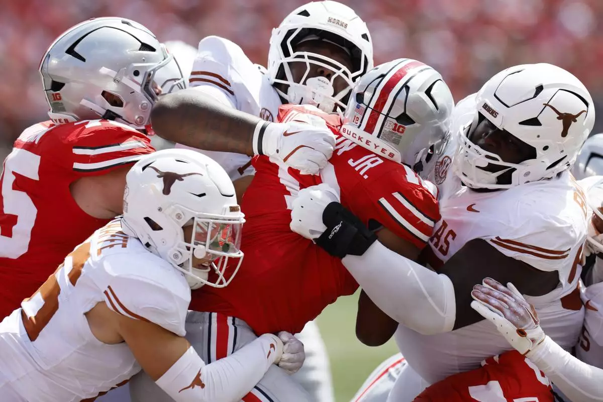 Ohio State running back CJ Donaldson is stopped by the Texas defense during the second half of an NCAA college football game, Saturday, Aug. 30, 2025, in Columbus, Ohio. (AP Photo/Jay LaPrete)