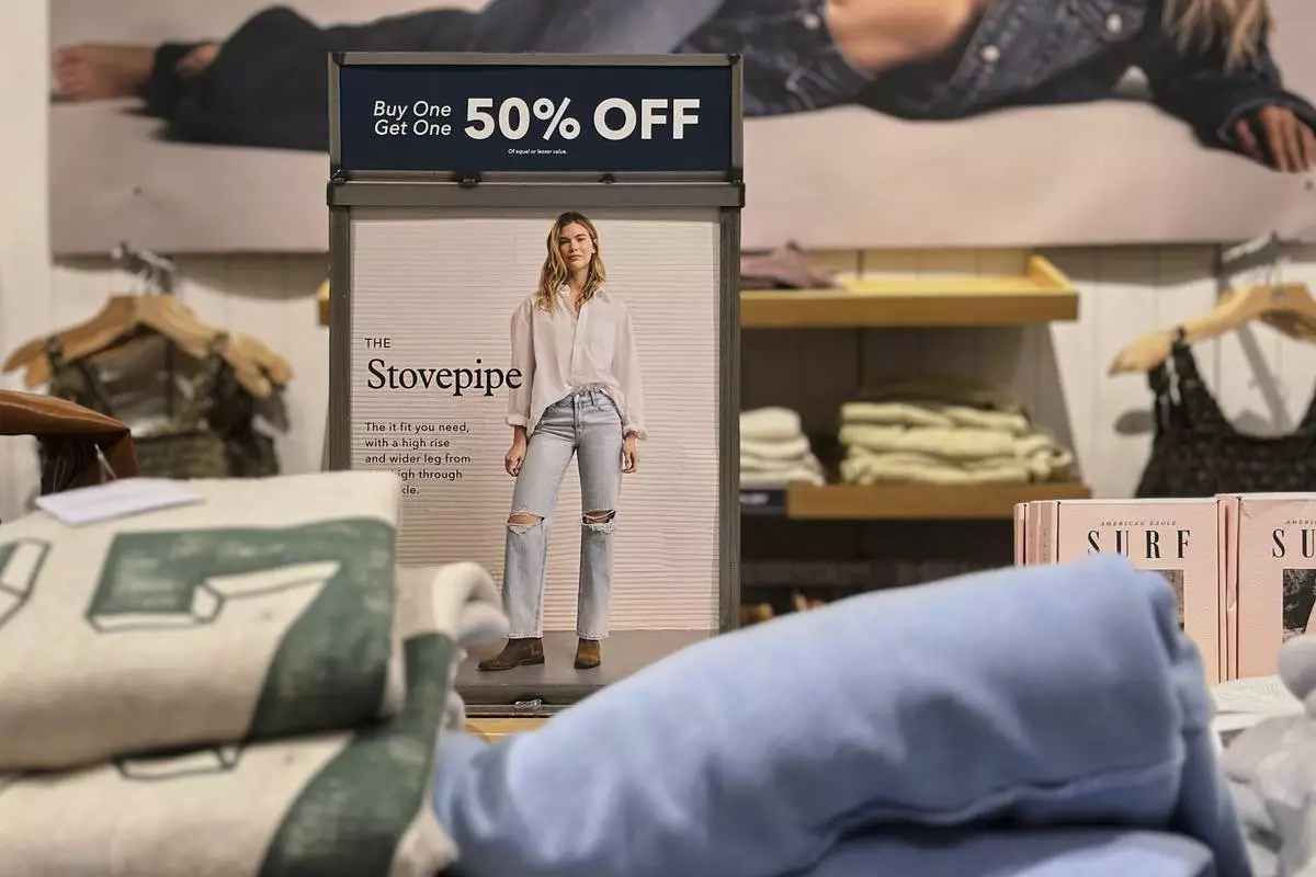 An ad for jeans is seen at American Eagle Outfitters, Thursday, Sept. 4, 2025, in Bellevue, Wash. (AP Photo/Lindsey Wasson)