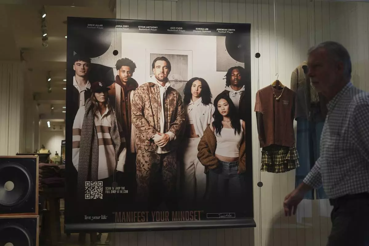 A shopper walks by an ad featuring Kansas City Chiefs' Travis Kelce outside an American Eagle Outfitters, Thursday, Sept. 4, 2025, in Bellevue, Wash. (AP Photo/Lindsey Wasson)