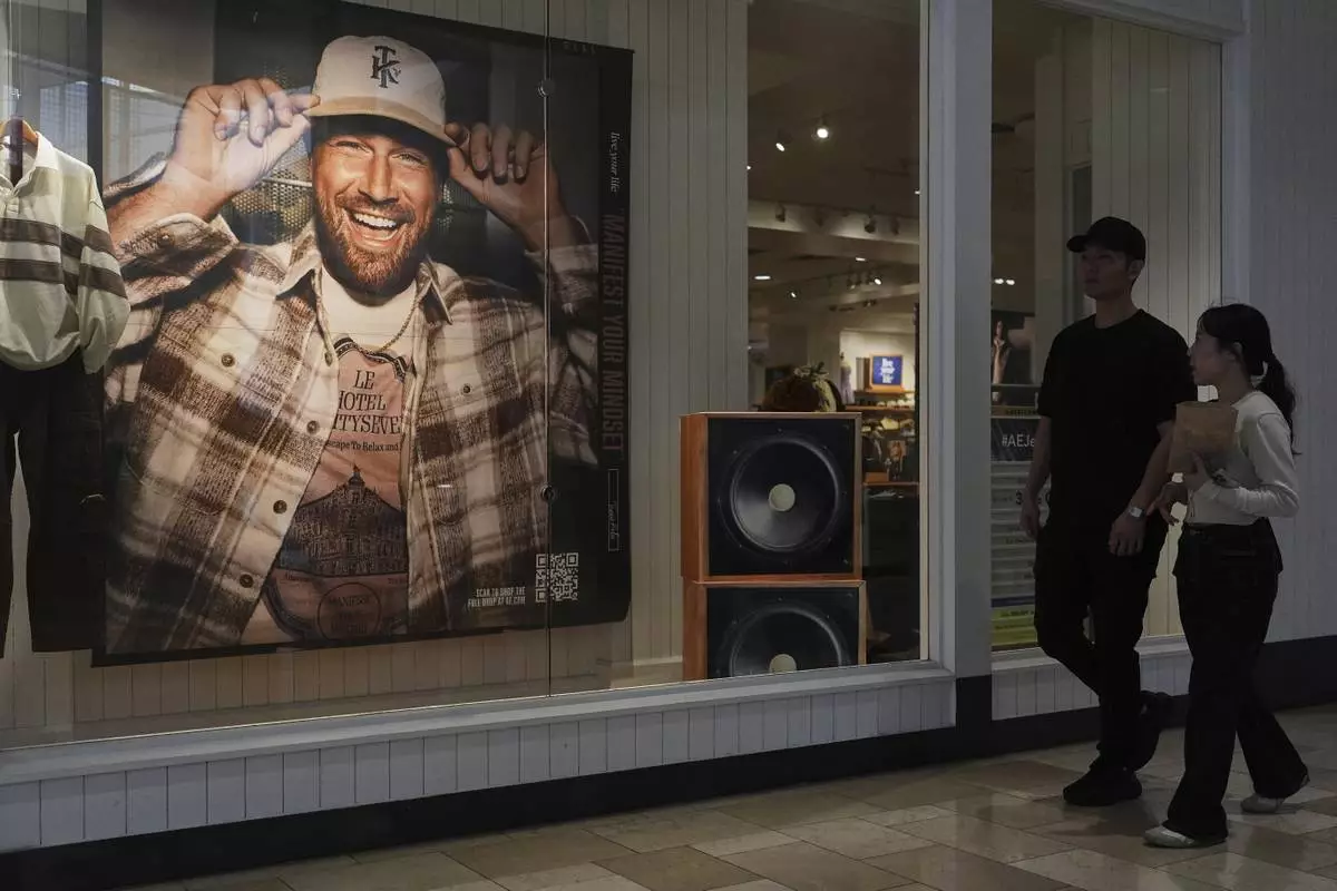 Shoppers walk by an ad featuring Kansas City Chiefs' Travis Kelce outside an American Eagle Outfitters, Thursday, Sept. 4, 2025, in Bellevue, Wash. (AP Photo/Lindsey Wasson)