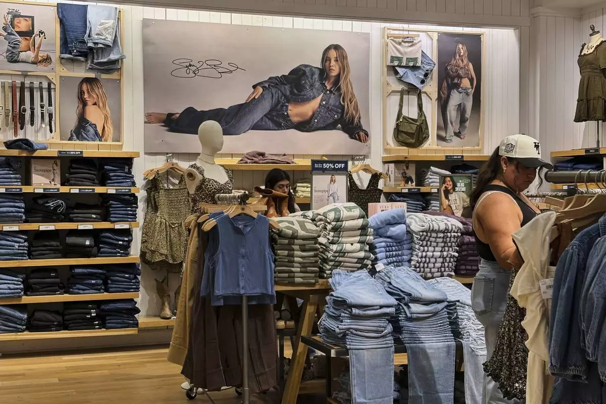 A Sydney Sweeney jeans ad is seen as shoppers browse at an American Eagle Outfitters, Thursday, Sept. 4, 2025, in Bellevue, Wash. (AP Photo/Lindsey Wasson)