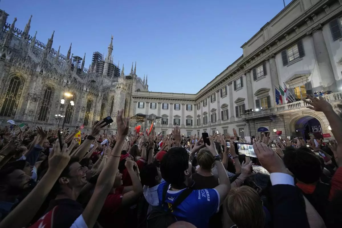 Ferrari fans cheer Ferrari driver Lewis Hamilton of Britain and his teammate Charles Leclerc of Monaco, on the occasion of a sponsor event in front of the Duomo gothic cathedral, in Milan, Italy , Wednesday, Sept. 3, 2025. The Formula one race will be held on Sunday. (AP Photo/Luca Bruno)