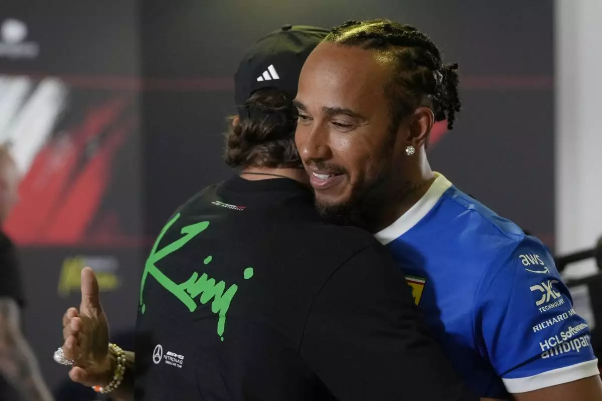 Mercedes driver Andrea Kimi Antonelli of Italy, left, hugs Britain's Lewis Hamilton at the Monza racetrack, in Monza, Italy, Thursday, Sept. 4, 2025. (AP Photo/Luca Bruno)