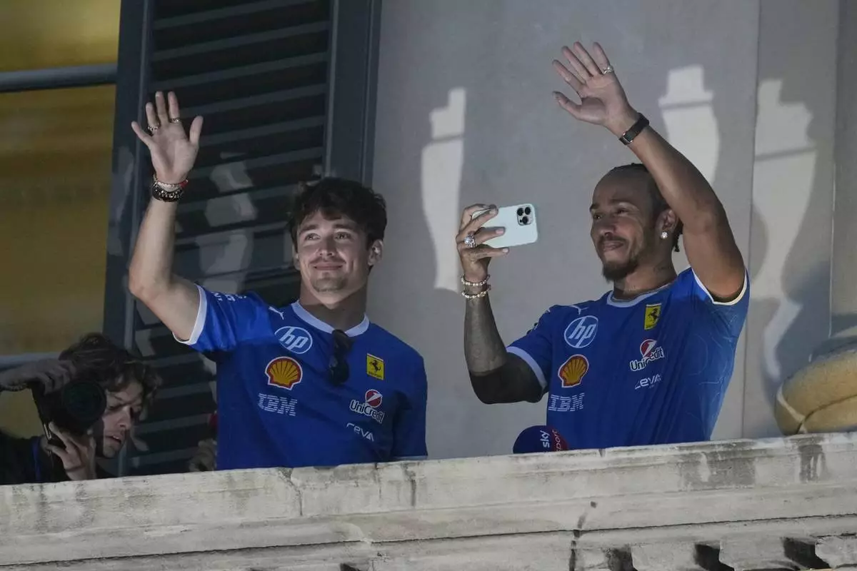 Ferrari driver Lewis Hamilton of Britain, right, and his teammate Charles Leclerc of Monaco, wave to fans from a balcony on the occasion of a sponsor event in Milan, Italy, Wednesday, Sept. 3, 2025. The Formula one race will be held on Sunday. (AP Photo/Luca Bruno)