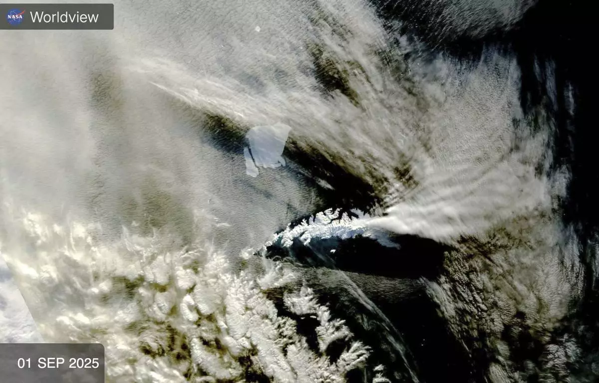 An iceberg, known as A23a, top, seen on a NASA satellite, is visible near South Georgia Island, bottom, on Sept. 1, 2025, off the coast of Antarctica. (NASA Worldview via AP)