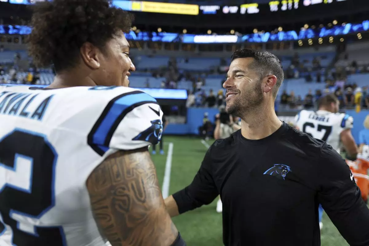 Carolina Panthers head coach David Canales greets guard Chandler Zavala after an NFL preseason football game between the Carolina Panthers and the Pittsburgh Steelers, Thursday, Aug. 21, 2025, in Charlotte, N.C. (AP Photo/Scott Kinser)
