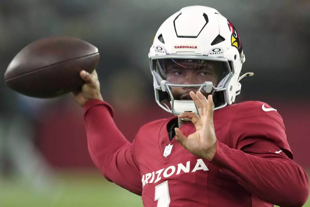 Arizona Cardinals quarterback Kyler Murray warms up prior to an NFL preseason football game agaisnt the Las Vegas Raiders, Saturday, Aug. 23, 2025, in Glendale. (AP Photo/Ross D. Franklin)