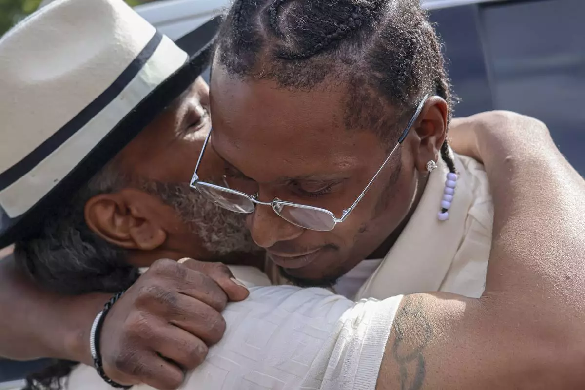 Bryan Hooper Jr., right, puts an earring on his father Bryan Hooper Sr. outside Stillwater Prison on Thursday, Sept. 4, 2025, in Bayport, Minn. (Matt Sepic/Minnesota Public Radio via AP)