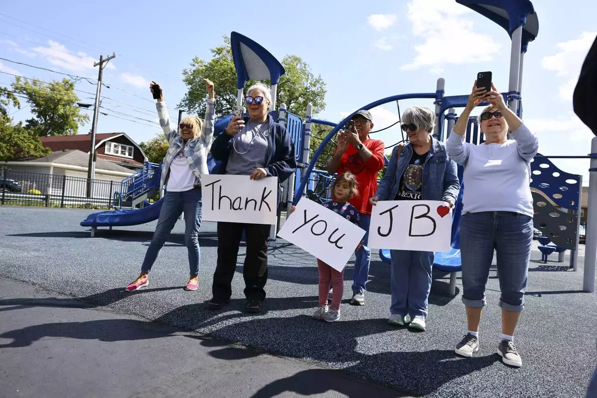 Local residents hold up signs as Gov. JB Pritzker speaks with reporters after visiting Prairie Oak Elementary School in Berwyn, Ill., Thursday, Sept. 4, 2025. (Anthony Vazquez/Chicago Sun-Times via AP, Pool)