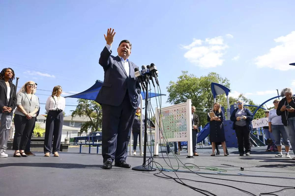 Gov. JB Pritzker speaks with reporters after visiting Prairie Oak Elementary School in Berwyn, Ill., Thursday, Sept. 4, 2025. (Anthony Vazquez/Chicago Sun-Times via AP, Pool)