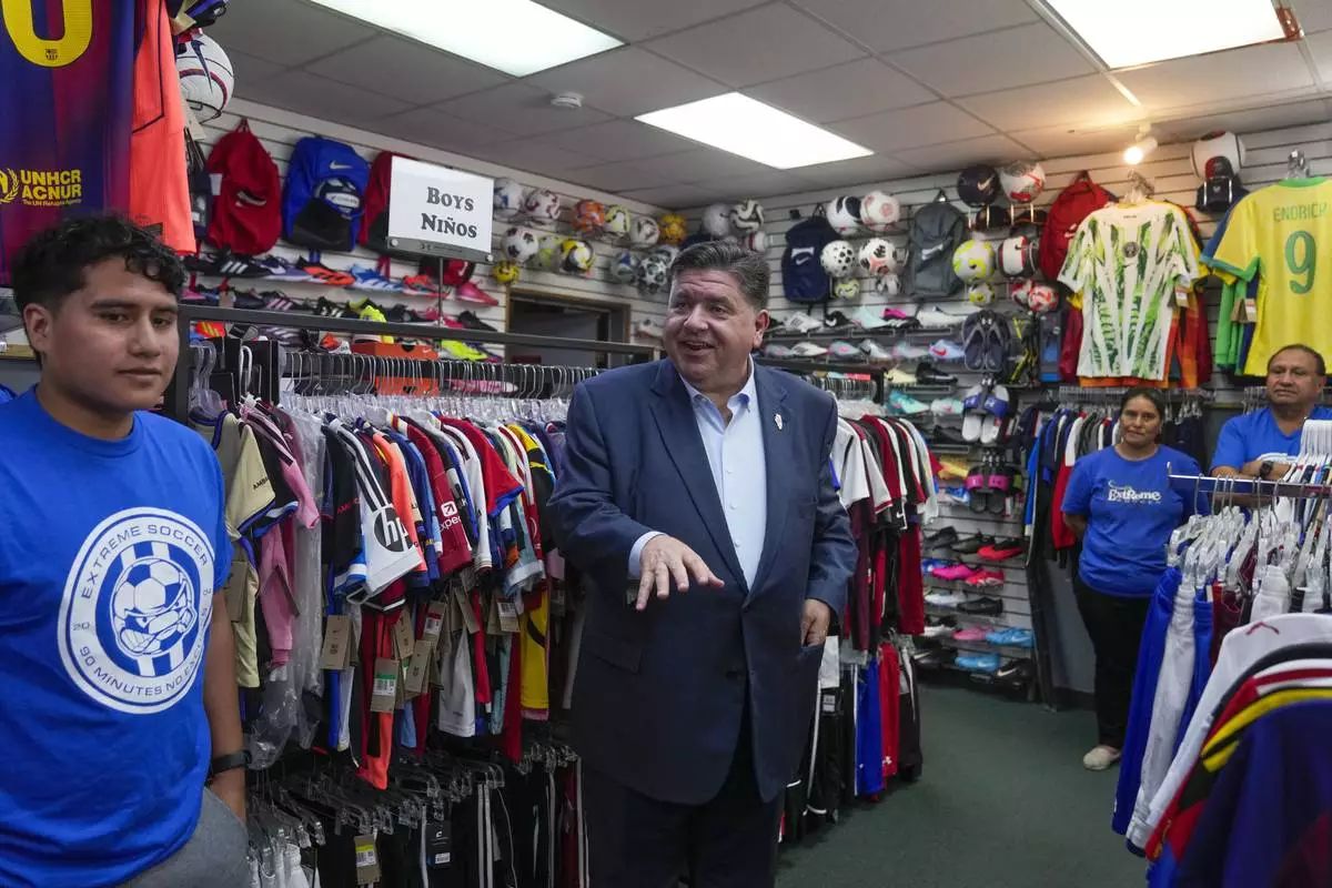 Illinois Gov. J.B. Pritzker visits with members of the family-owned soccer gear business Extreme Soccer, Thursday, Sept. 4, 2025, in Berwyn, Ill. (AP Photo/Erin Hooley)