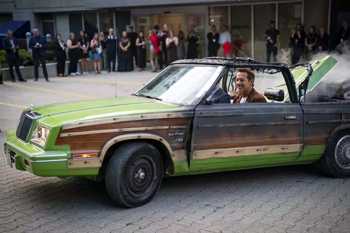 Producer Ryan Reynolds and director Colin Hanks drive in a replica prop car from the movie "Planes, Trains and Automobiles" prior to the premiere of "John Candy: I Like Me" at the Toronto International Film Festival, in Toronto on Thursday, Sept. 4, 2025. (Arlyn McAdorey/The Canadian Press via AP)