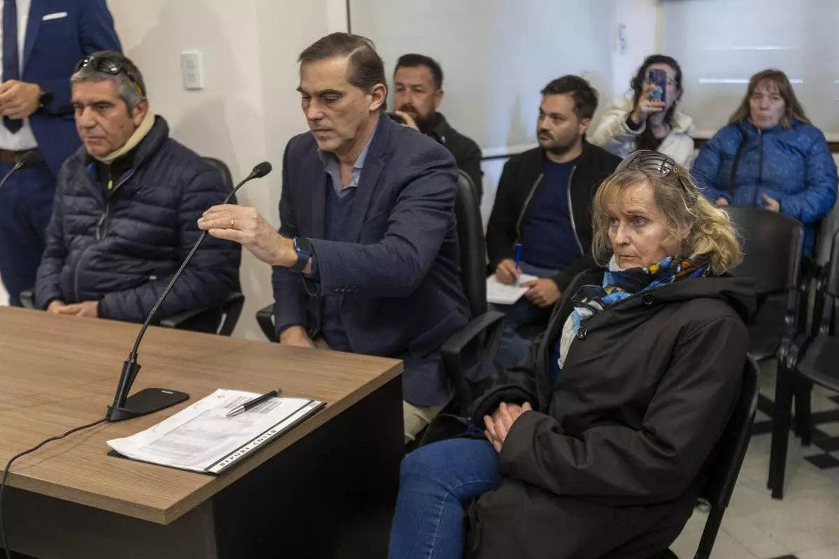 Patricia Kadgien, right, one of the daughters of fugitive Nazi official Friedrich Kadgien, and her husband, Juan Carlos Cortegoso, left, attend a court hearing in the case of the theft of the 18th-century Italian "Portrait of a Lady," which was taken from a Jewish collector during World War II, in Mar del Plata, Argentina, Thursday, Sept. 4, 2025. (AP Photo/Christian Heit)
