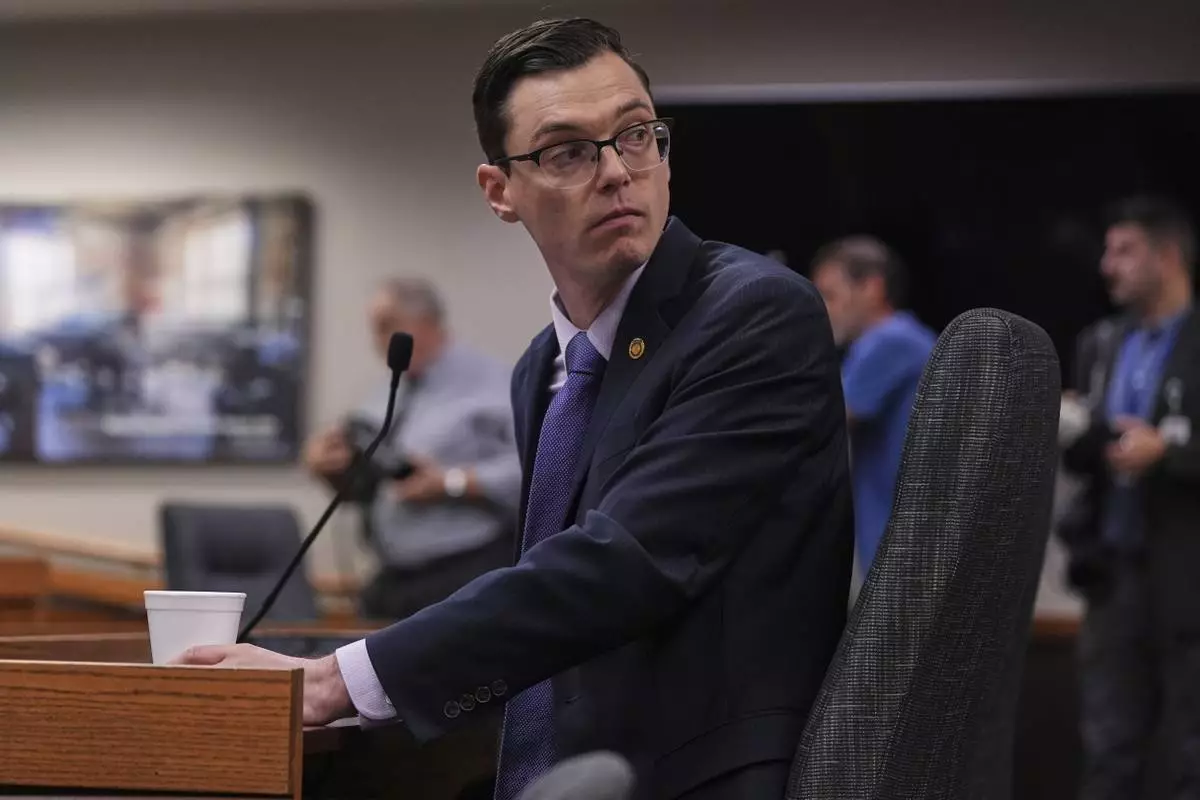 Missouri state Rep. Dirk Deaton, R-Seneca, sponsor of a bill that would redraw the state's U.S. House districts, looks into the crowd behind him as he testifies during a committee hearing on the subject Thursday, Sept. 4, 2025, in Jefferson City, Mo. (AP Photo/Jeff Roberson)