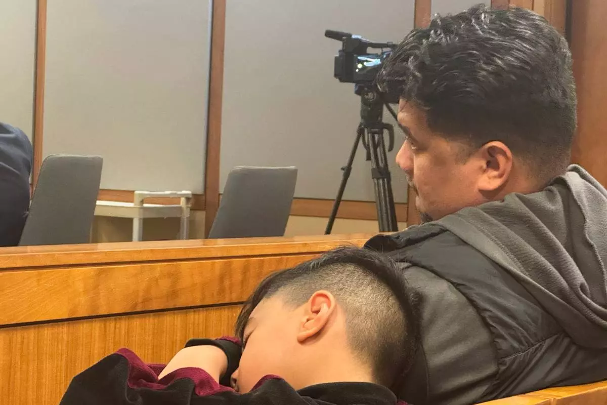 Michael Pese, one of the 10 American Samoa natives charged by the state of Alaska for voting irregularities, waits for his arraignment in a courtroom Thursday, Sept. 4, 2025, in Anchorage, Alaska, while his son Maximus naps. (AP Photo/Mark Thiessen)