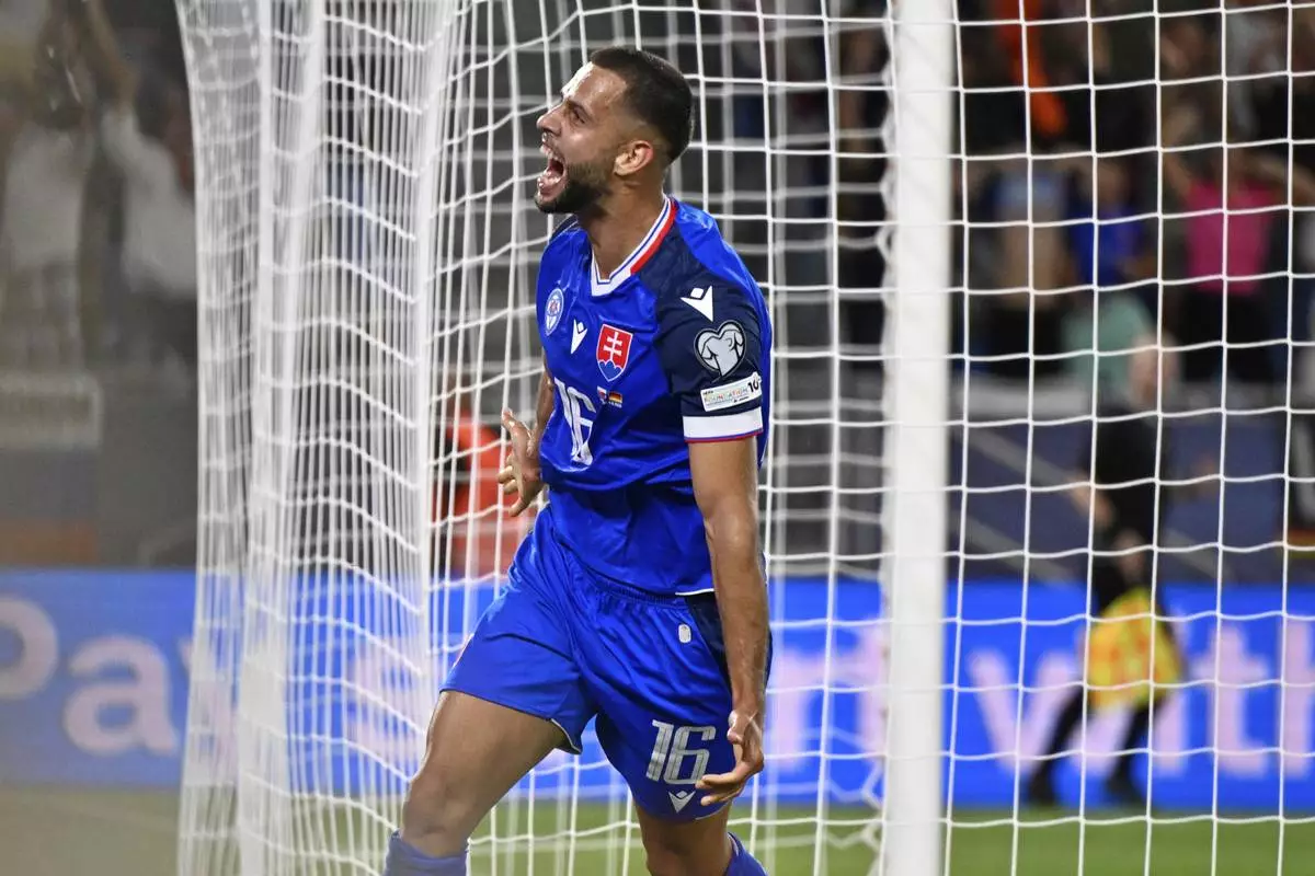 Slovakia's David Hancko celebrates after scoring the opening goal during the World Cup Group A qualifying soccer match between Slovakia and Germany in Bratislava, Slovakia, Thursday, Sept. 4, 2025. (AP Photo/Denes Erdos)