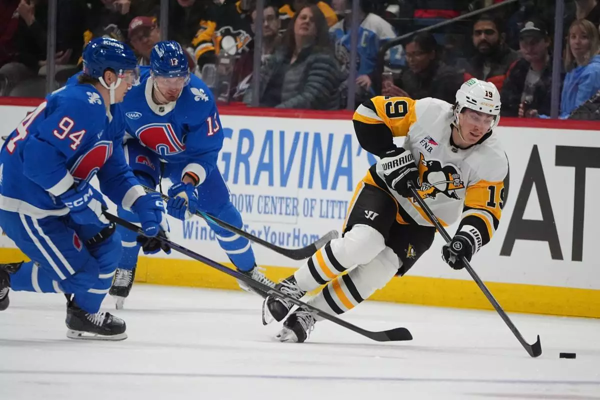 Pittsburgh Penguins center Connor Dewar, right, collects the puck as Colorado Avalanche left wing Joel Kiviranta (94) and right wing Valeri Nichushkin, back left, defend in the second period of an NHL hockey game Monday, March 16, 2026, in Denver. (AP Photo/David Zalubowski)
