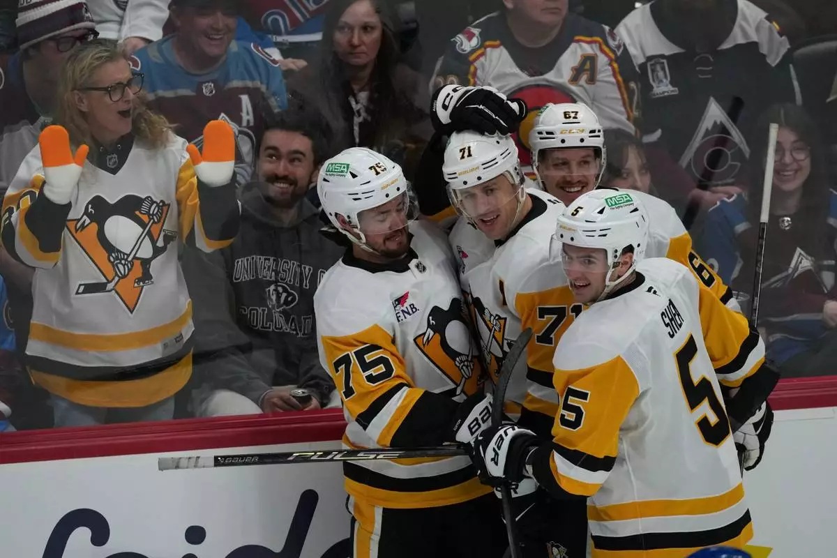 Pittsburgh Penguins center Evgeni Malkin, back center, is congratulated after scoring a goal by defenseman Connor Clifton, back left, right wing Rickard Rakell, back right, and defenseman Ryan Shea in the first period of an NHL hockey game against the Colorado Avalanche Monday, March 16, 2026, in Denver. (AP Photo/David Zalubowski)