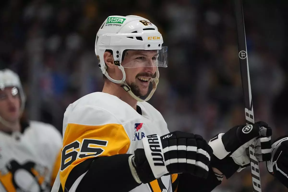 Anthony Mantha, Elmer Soderblom, Erik Karlsson, Bryan Rust and Noel Acciari also scored for the Penguins, who matched their season high for goals on just 20 shots while playing for the 11th straight game without star center Sidney Crosby. Pittsburgh's leading scorer, who sustained a lower-body injury while playing for Canada in the Winter Olympics last month, has been skating with the team during this five-game trip that wraps up Wednesday.