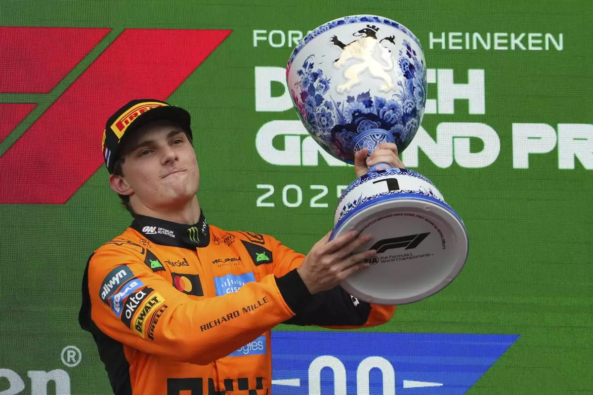 McLaren driver Oscar Piastri of Australia celebrtaes after winningthe Formula One Dutch Grand Prix in Zandvoort, Netherlands, Sunday, Aug. 31, 2025. (AP Photo/Peter Dejong)