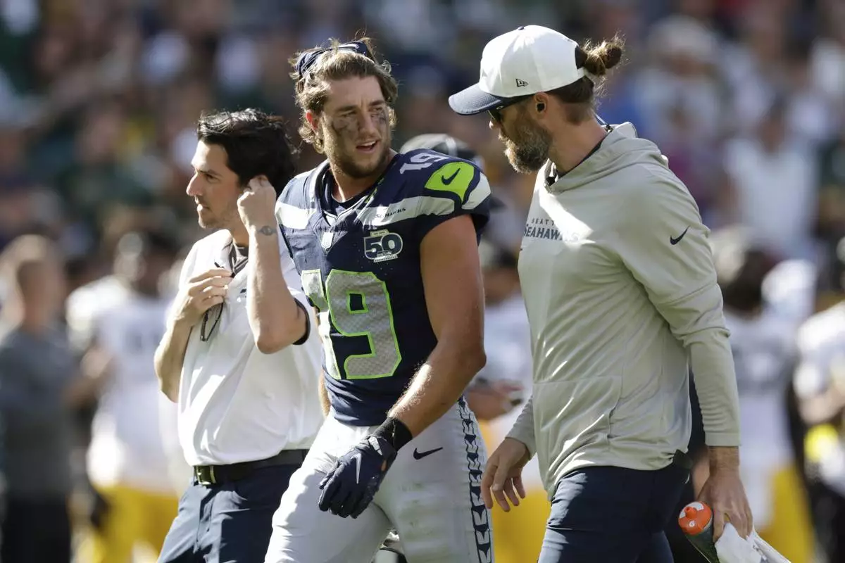 Seattle Seahawks' Jake Bobo leaves the field after an injury during the first half of a preseason NFL football game against the Green Bay Packers Saturday, Aug. 23, 2025, in Green Bay, Wis. (AP Photo/Matt Ludtke)