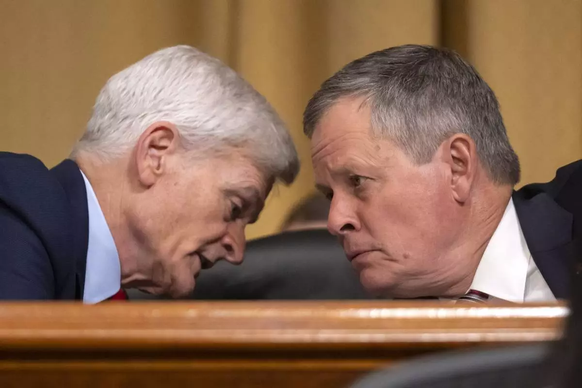 Sen. Bill Cassidy, R-La., left, talks with Sen. Steve Daines, R-Mont., as Secretary of Health and Human Services Robert F. Kennedy Jr., appears before the Senate Finance Committee, on Capitol Hill in Washington, Thursday, Sept. 4, 2025. (AP Photo/Mark Schiefelbein)